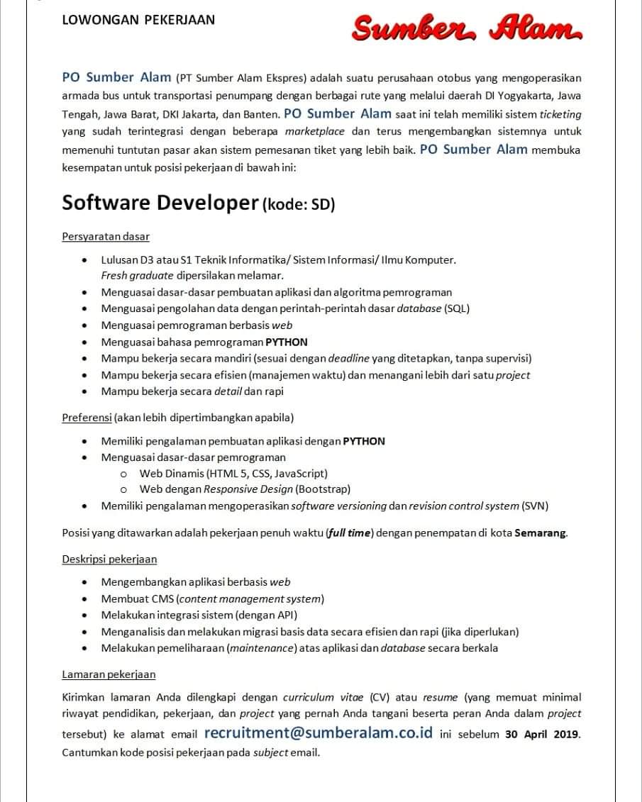 Lowongan Kerja Software Developer PO Sumber Alam Max. 30 April 2019