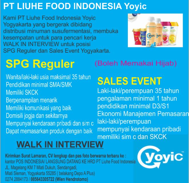 PT Liuhe Food Indonesia Yoyic yogyakarta yang bergerak dibidang distribusi minuman susu fermentasi membuka kesempatan kerja untuk para pencari kerja posisi Asisten Akutansi, supervisor sales penjualan, supervisor sales event, sales dan manager sales diutamakan berdomisili di yogyakarta dan sekitarnya alamat kami dijalan magelang km 7 melati dukuh rt 11 rw 5 sendangadi melati kabupaten sleman yogyakarta (belakang depo Aplus)