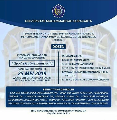 Untuk Info selengkapnya silahkan kunjungi situs resmi penerimaan Dosen UMS sebelum 25 Mei 2019 :