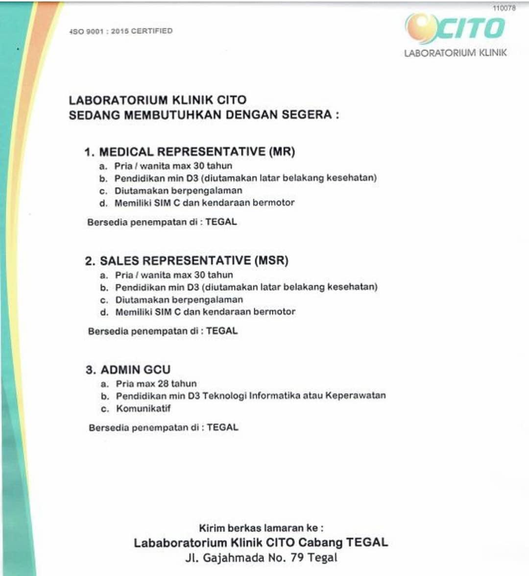 Lowongan Kerja Lab. Klinik CITO April 2019 - MR, SR, Admin - Tegal