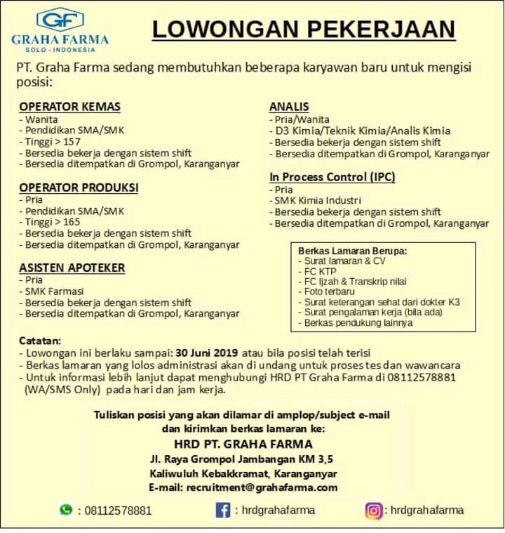 Lowongan Kerja PT Graha Farma Mei - Juni 2019 - Berbagai Posisi - Karanganyar