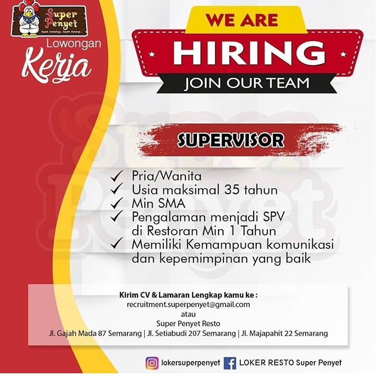 Super Penyet Resto membuka lowongan kerja, posisi yang ditawarkan adalah Supervisor. Jika kamu berminat, kamu haraus memiliki kualifikasi berikut :