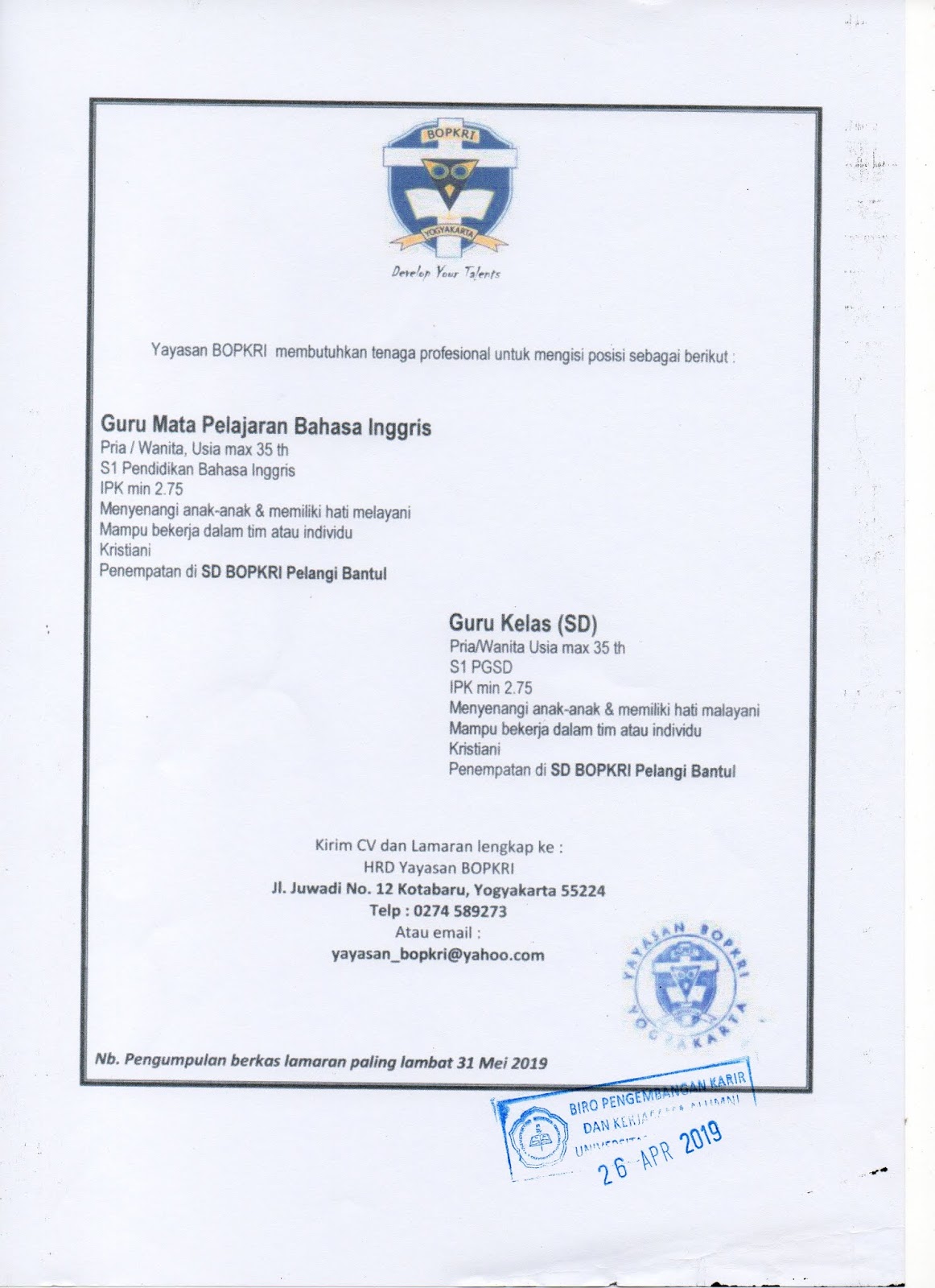 Yayasan BOPKRI membutuhkan tenaga profesional untuk mengisi posisi sebagai berikut :
