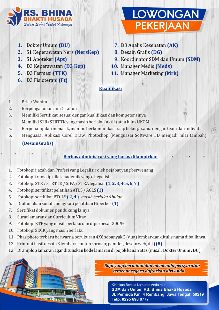 Sebuah RS swasta di bawah PT. Bhina Raharja Husada, dibangun di atas lahan +/- 10.000 m2, di Jl. Pemuda Km. 4 Rembang, Jawa Tengah. Bangunan 6 lantai dengan lahan parkir untuk sekitar +/- 50 mobil.Dalam memberikan pelayanan kesehatan, RS Bhina Bhakti Husada memiliki komitmen untuk melayani dengan sepenuh hati, menyelenggarakan pelayanan kesehatan yang bermutu dan efisien yang berpedoman pada Visi dan Misi RS Bhina Bhakti Husada.