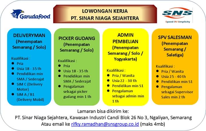 PT. Sinar Niaga Sejahtera (SNS) berdiri pada 31 Juli 1994. PT. Sinar Niaga Sejahtera atau biasa disingkat dengan SNS merupakan perusahaan yang menjadi distributor resmi dari produk Garudafood.