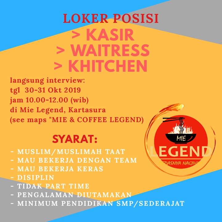 BUTUH SEGERA!! Loker untuk Kasir, Waitress, DapurMie Dan Coffee Legend Kartasura - Oktober 2019