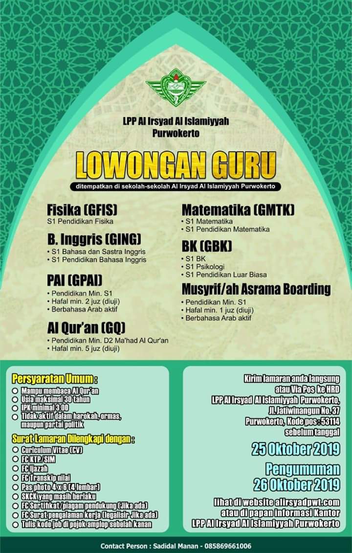 Lowongan Kerja Guru LPP AI Irsyad Al Islamiyyah Purwokerto 2019