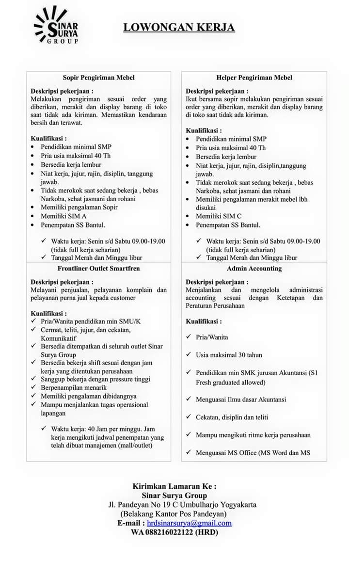 Lowongan Kerja Sinar Surya Group (Supir, Helper, Frontliner, Admin Accounting) - Yogyakarta