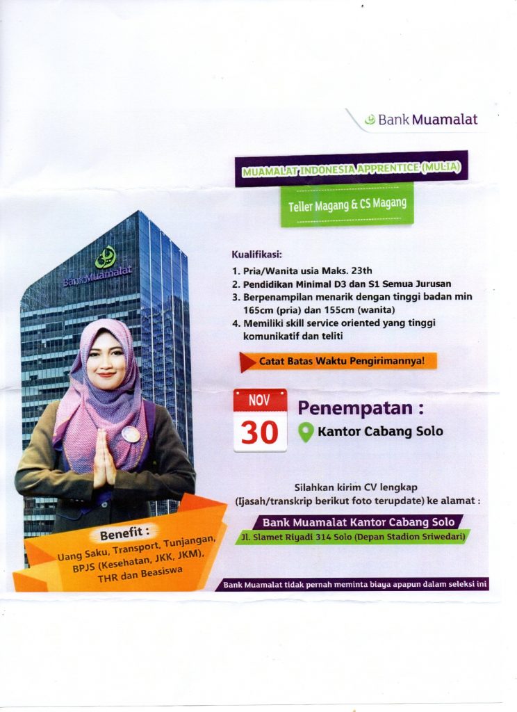 Lowongan Kerja Teller dan CS Bank Muamalat Cabang Solo