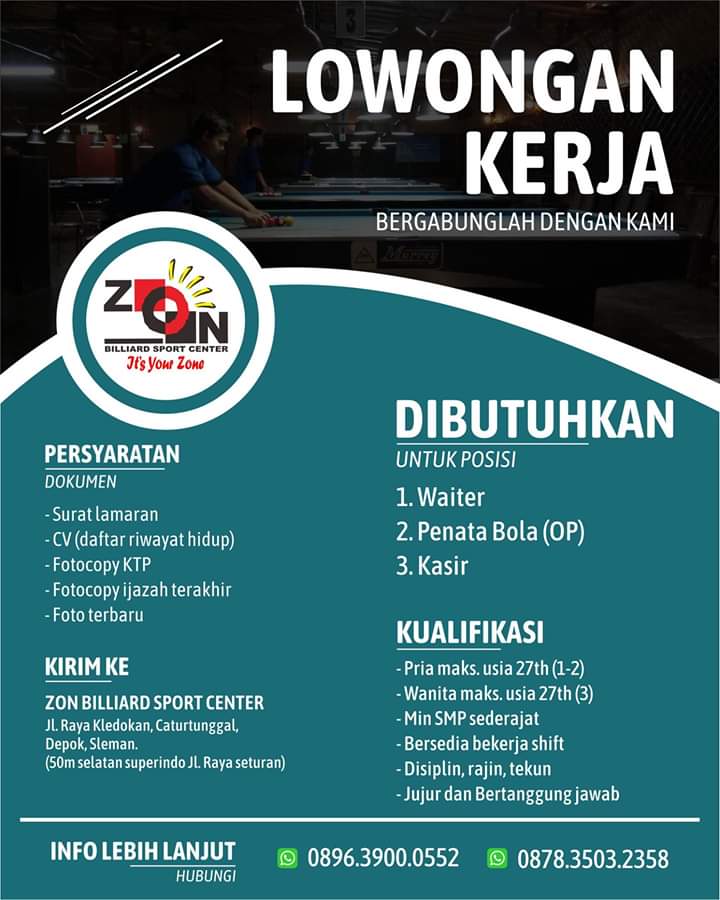 Lowongan Kerja Zon Billiard Sport Center Jogja Posisi Waiter, Penata Bola dan Kasir
