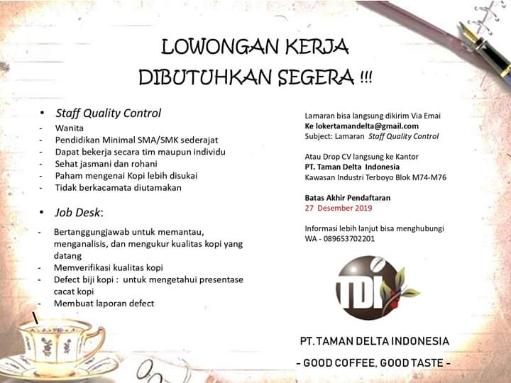 Lowongan Kerja PT. Taman Delta Indonesia Posisi Staff Quality Control Semarang