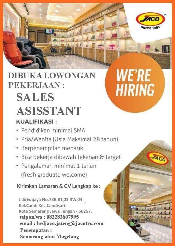 Lowongan Kerja Sales Assistant di PT Jaco Nusantara Mandiri Semarang & Magelang 2020