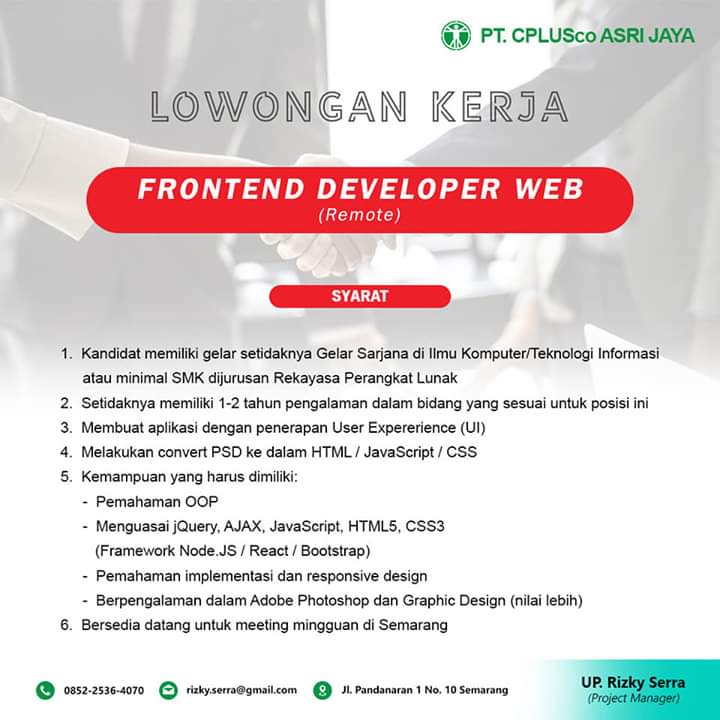 Lowongan kerja BackEnd Developer Web dan FrontEnd Developer Web (Remote) - Semarang