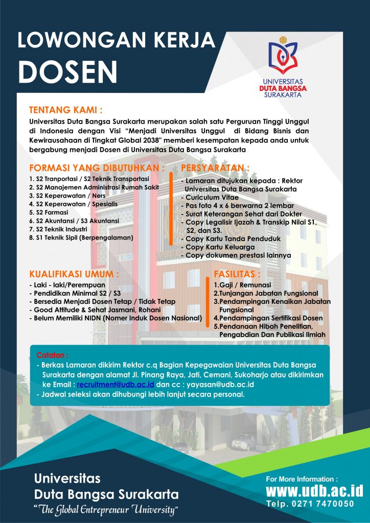 Berkas Lamaran dikirim Rektor c.q Bagian Kepegawaian Univeritas Duta Bangsa Surakarta dengan alamat JL. Pinang Raya, Jati, Cemahi, Sukoharjo, atau dikirimkan ke email :