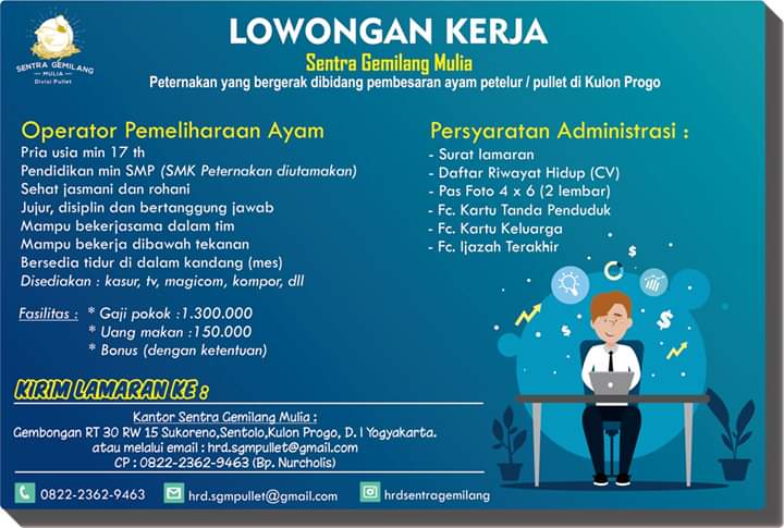 Lowongan kerja Operator pemeliharaan ayam Sentra Gemilang Mulia Kulon Progo
