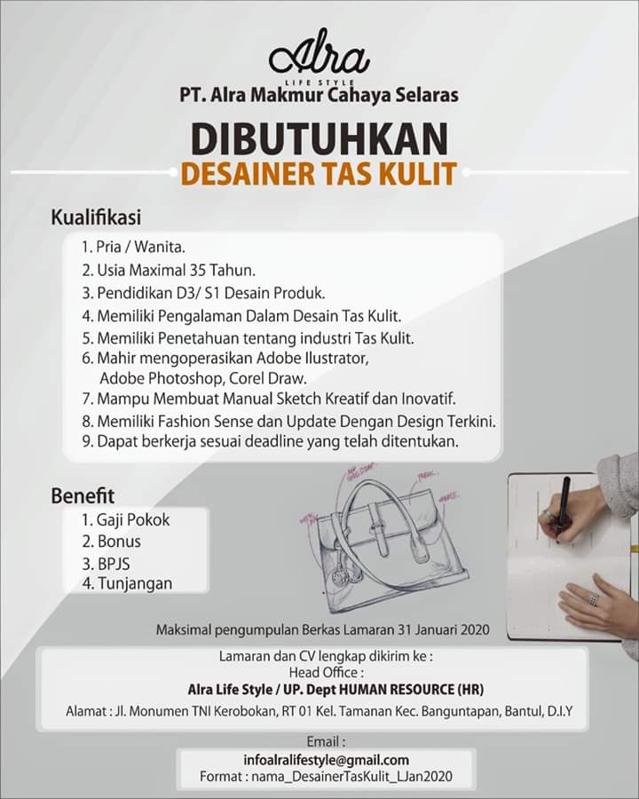 Lowongan kerja PT. Alra Makmur Cahaya Selaras - Desainer Tas Kulit - Bantul Yogyakarta