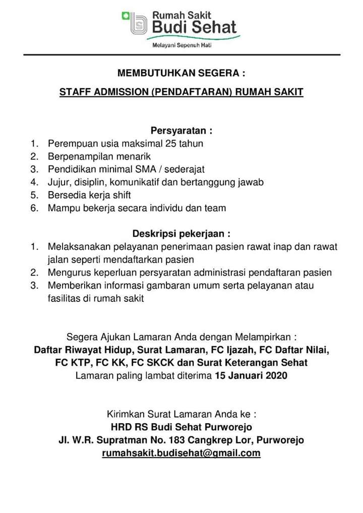 Lowongan Kerja RS Budi Sehat Purworejo Posisi Staf Pendaftaran Januari 2020