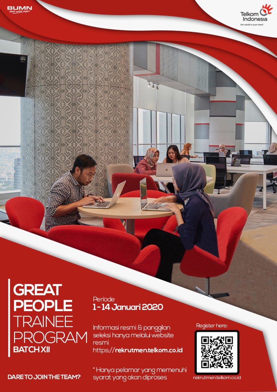 Telkom Group mengajak talenta-talenta terbaik bangsa untuk bergabung melalui Great People Trainee Program sesuai minat, keahlian dan kompetensi untuk memenuhi tuntutan global. Peluang bergabung terbuka lebar bagi talenta kreatif yang bersemangat menimba pengalaman dan siap memperkuat supertim kami.