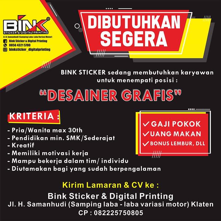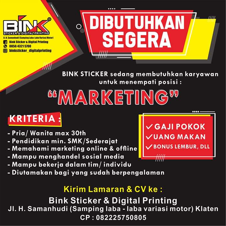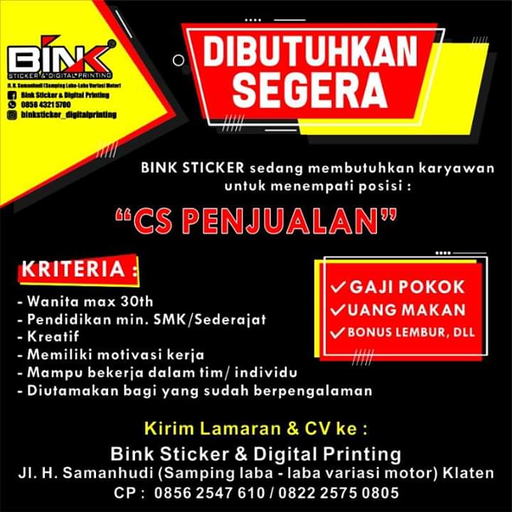 Lowongan kerja : Bink Sticker Klaten membutuhkan karyawan untuk mengisi posisi : MARKETING, CUSTOMER SERVICE, KASIR, DESAINER GRAFIS, CS PENJUALAN Ditulis Admin Selasa, 25 Februari 2020 URGENT!! DIBUTUHKAN SEGERA !!! Bink Sticker membutuhkan karyawan untuk mengisi posisi : -MARKETING -CUSTOMER SERVICE -KASIR -DESAINER GRAFIS -CS PENJUALAN Untuk syarat melamar bisa baca di postingan berikut. Bagikan Loker ini