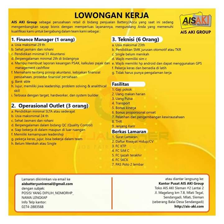 Lowongan kerja Finance Manager, Operasional outlet, dan Teknisi - AIS AKI Yogyakarta