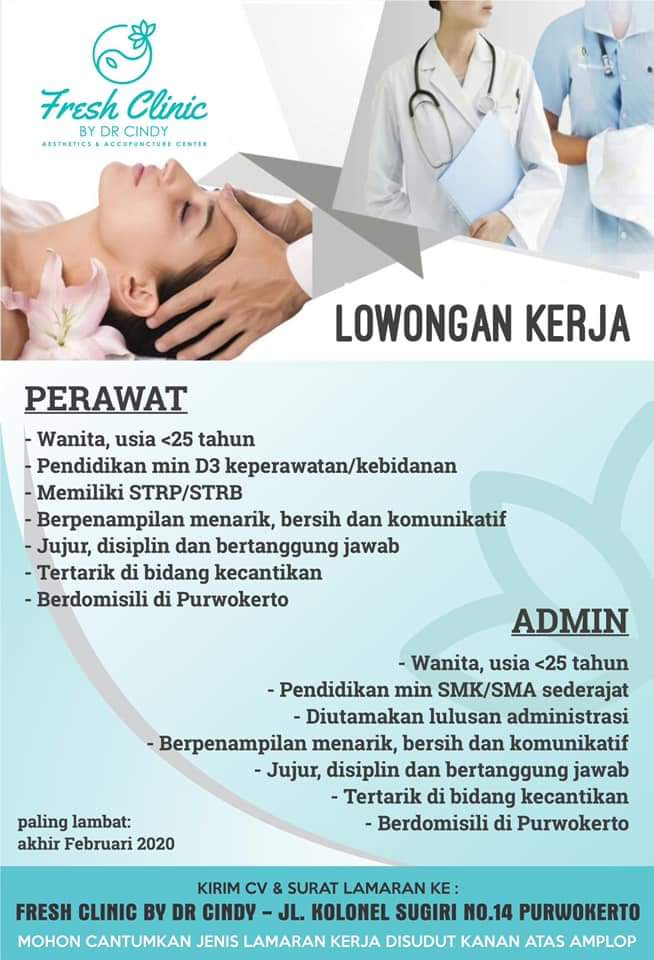 Lowongan Kerja Perawat Estetika dan Admin - Fresh Clinic By. dr. Cindy Purwokerto Ditulis Admin Sabtu, 15 Februari 2020 Edit Lowongan Kerja Fresh Clinic By. dr. Cindy Purwokerto - Perawat Estetika - Admin Penempatan Purwokerto Yang minat langsung saja kirim lamaran ke alamat yang tertulis, thanks Bagikan Loker ini