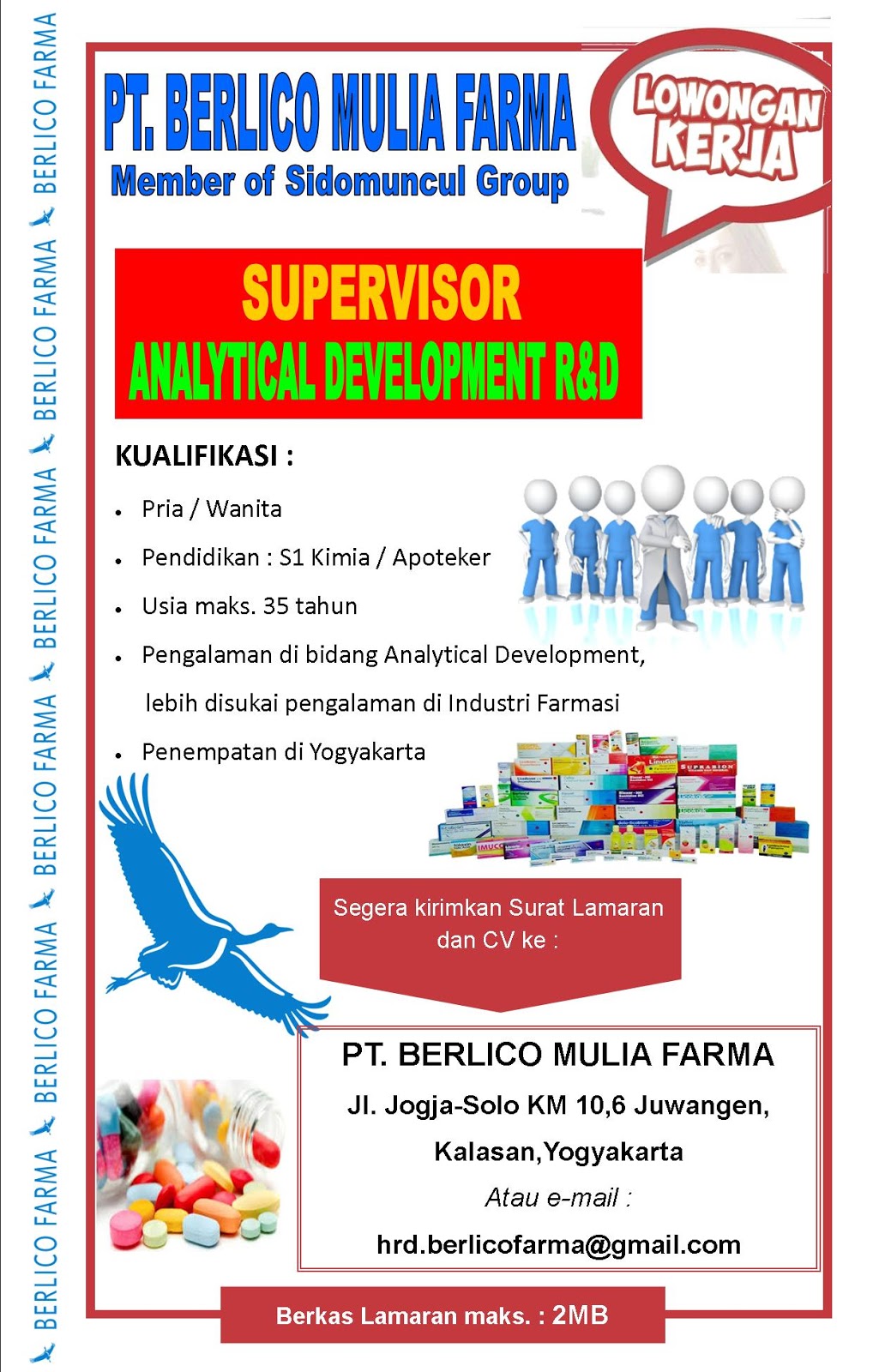 Lowongan kerja PT. Berlico Mulia Farma - Supervisor Analytical Development R&D; - Yogyakarta