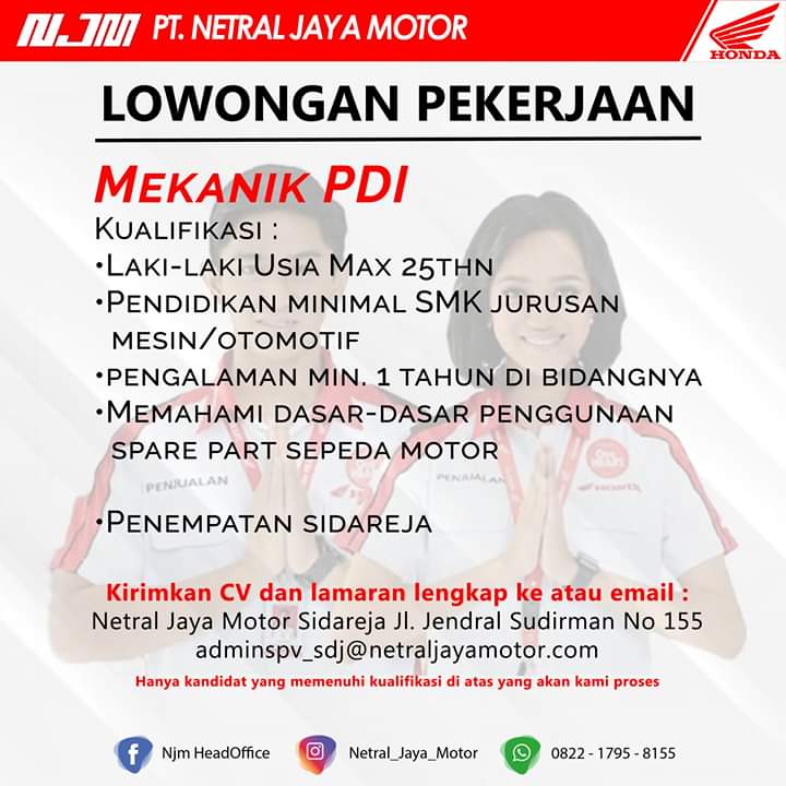 kirimkan segera CV dan lamaran ke Netral Jaya Motor Sidareja atau ke email