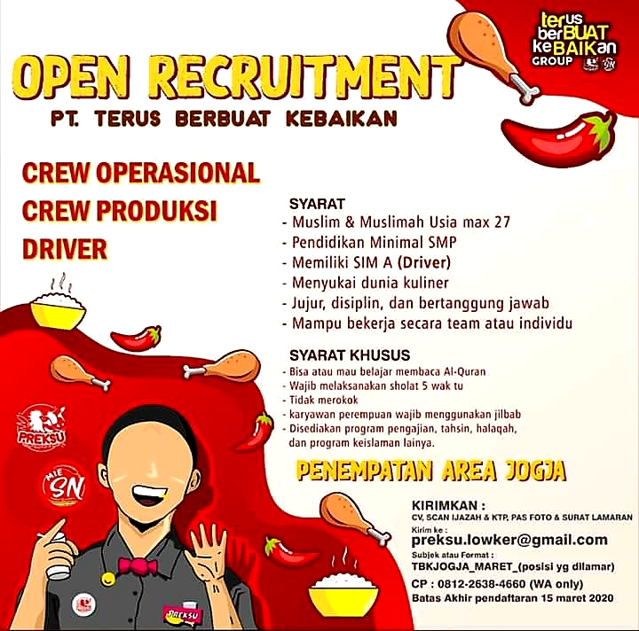 Lowongan kerja PT. Terus Berbuat Kebaikan, Ayam Geprek & Susu (Preksu) dan Mie SN (sambal nusantara) - CREW OPERASIONAL, CREW PRODUKSI, DRIVER - Jogja