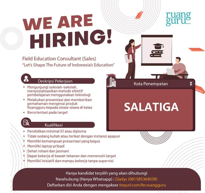 Ruangguru, perusahaan teknologi terbesar & terlengkap di Indonesia yang berfokus pada layanaan berbasis pendidikan, sedang membuka kesempatan bagi teman-teman di area Salatiga & sekitarnya untuk menjadi Field Education Consultant.