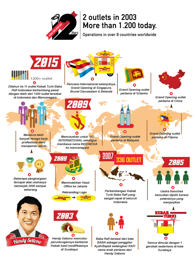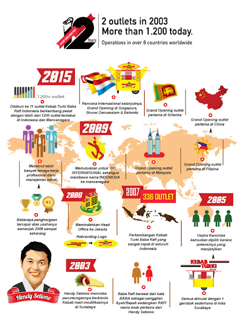Kebab Turki Baba Rafi semakin membuktikan kiprahnya dalam dunia waralaba, dibuktikan dengan merajalelanya warna merah dan kuning yang melekat pada outlet bertuliskan Kebab Turki Baba Rafi ‘The World’s Biggest Kebab Chain’.