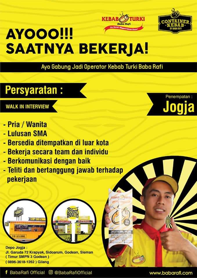 Dibutuhkan segera Crew Kebab Turki Baba Rafi - Gaji 1.8 Juta per Bulan - Penempatan Area Yogyakarta