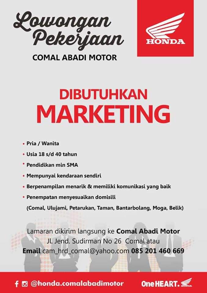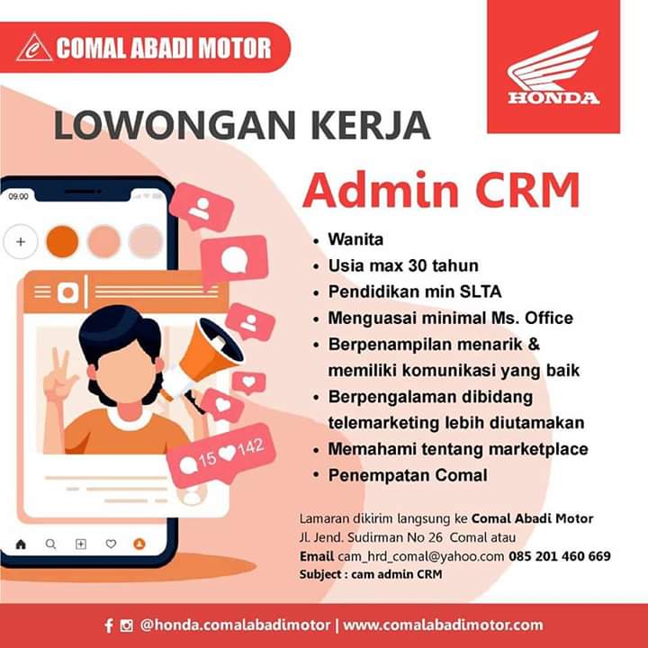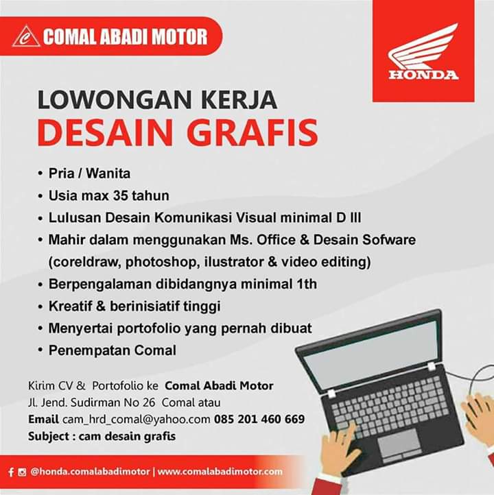 Lowongan kerja Comal Abadi Motor (Honda) - Admin CRM, Desain Grafis, Marketing - Pemalang Area