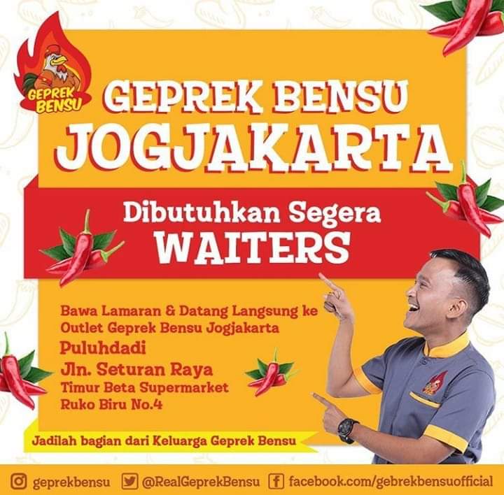 Lowongan kerja Geprek Bensu Yogyakarta - Waiters - Ditunggu segera!
