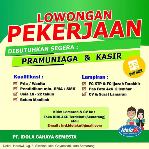 Bagi yang berminat silahkan kirimkan berkas lamaran lengkap ke TOKO IDOLAKU Siwalan atau email yang tertera pada gambar info lowongan di atas.