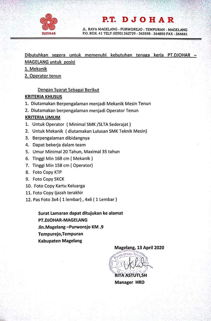Lowongan Kerja PT. Djohar Magelang Posisi Mekanik dan Operator Tenun