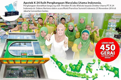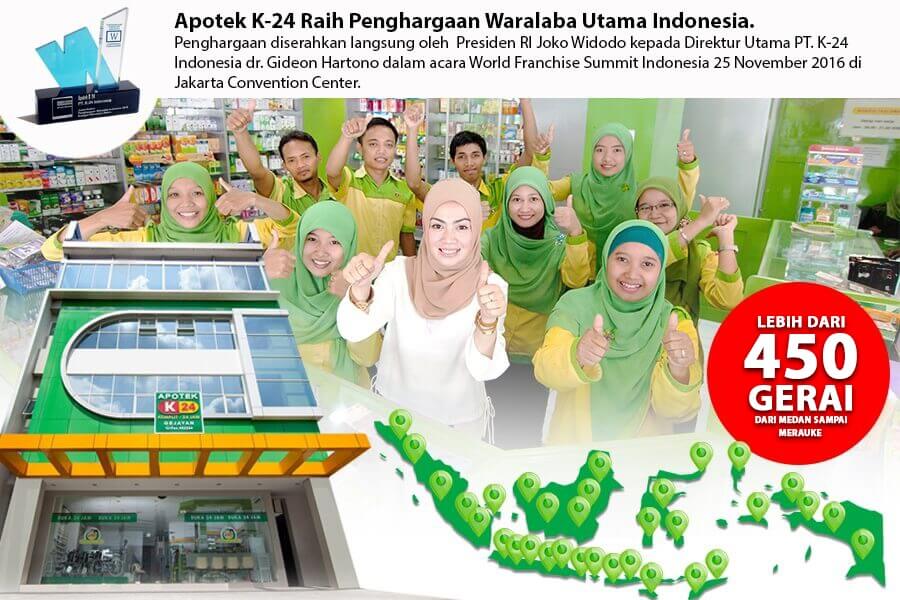 Berdiri tahun 2002, dalam kurun waktu 17 tahun Apotek K-24 telah berkembang hingga lebih dari 450 gerai yang tersebar di 115 kota/kabupaten dan 24 provinsi di Indonesia. Pengembangan Apotek K-24 di seluruh Indonesia dilakukan secara franchise atau waralaba maupun dengan membuka gerai sendiri (company owned). Dalam perjalanannya, Apotek K-24 selalu berusaha untuk mencetak prestasi dalam memberikan pelayanan terbaik bagi masyarakat Indonesia. Puluhan penghargaan telah diraih oleh Apotek K-24, salah satunya sebagai Apotek Asli Indonesia yang Pertama Kali Diwaralabakan hingga mendapatkan penghargaan sebagai Apotek Waralaba Terbaik di Indonesia.