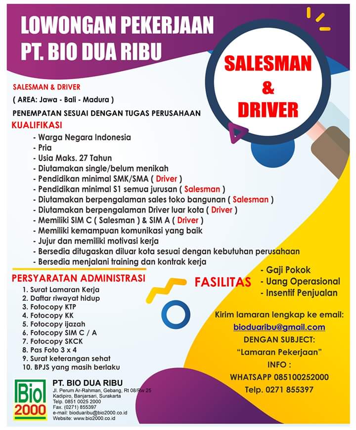 Lowongan Kerja Driver & Salesman di PT. Bio Dua Ribu (Jawa - Bali - Madura)