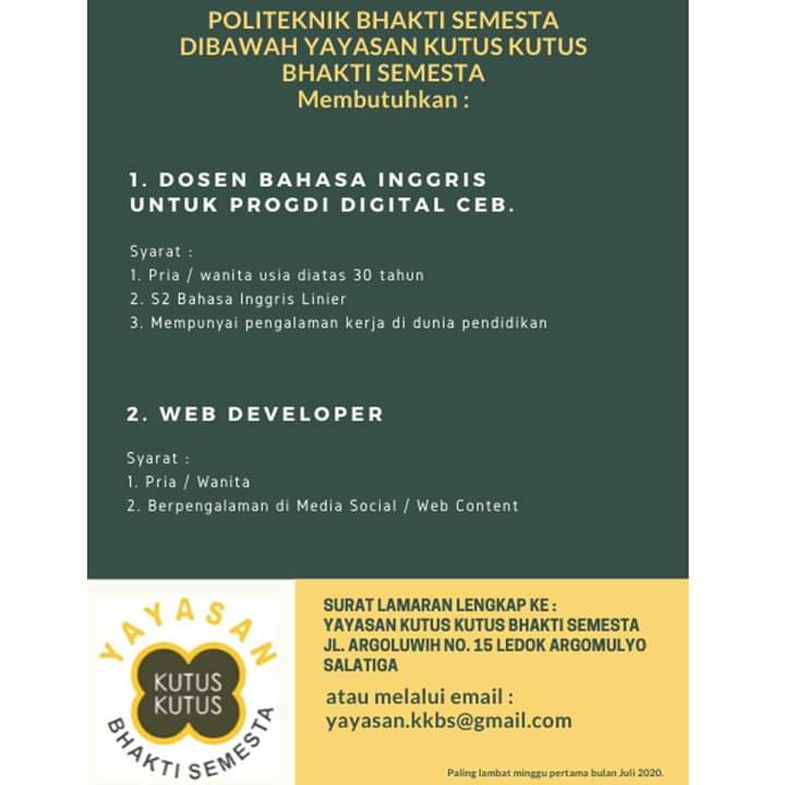 Loker Dosen Bahasa Inggris dan web Developer di Politeknik Bhakti Semesta Salatiga