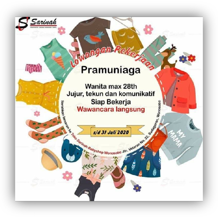 Serahkan lamaran ke Toko Sarinah Babyshop Wonosobo (Jl.Veteran No.32, Sudagaran,Wonosobo) batas akhir s/d 31 Juli 2020