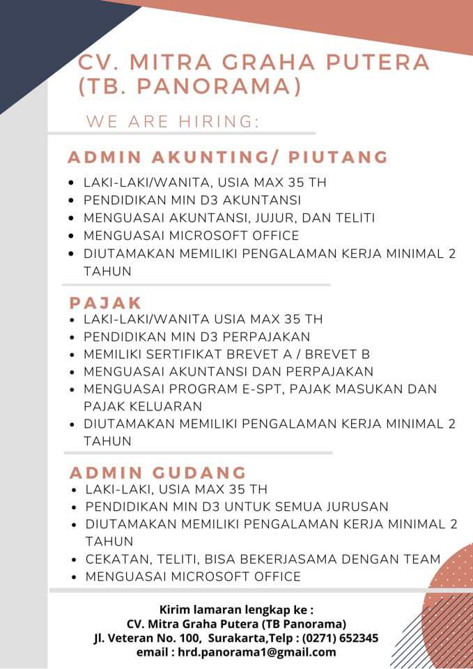 Lowongan kerja CV. Mitra Graha Putera (TB. Panorama) Solo - Akunting, Pajak, Admin Gudang