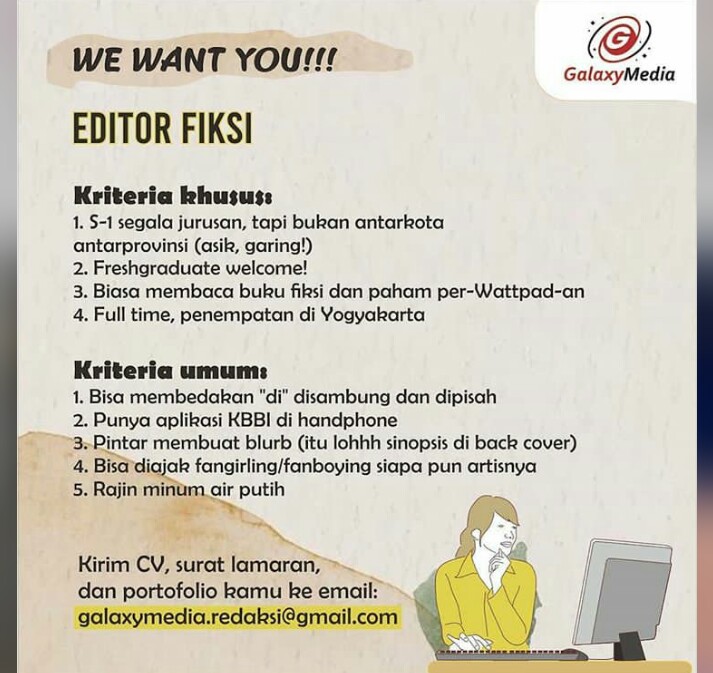 Lowongan Kerja Editor Fiksi di Galaxy Media Jogja Ditulis Admin Senin, 22 Juni 2020 Galaxy Media membuka lowongan pekerjaan untuk posisi Editor Fiksi dengan kriteria dibawah iniBagi anda yang berminat dan sesuai dengan kriteria diatas silahkan kirim CV, surat lamaran.dan fortofolio kamu ke email galaxymedia.redaksi@gmail.com Bagikan Loker ini