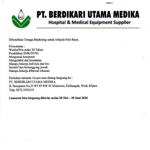 Lowongan kerja PT. Berdikari Utama Medika