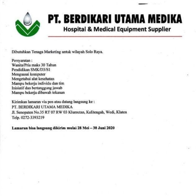 Lowongan Kerja PT. Berdikari Utama Medika (Marketing) Solo Raya