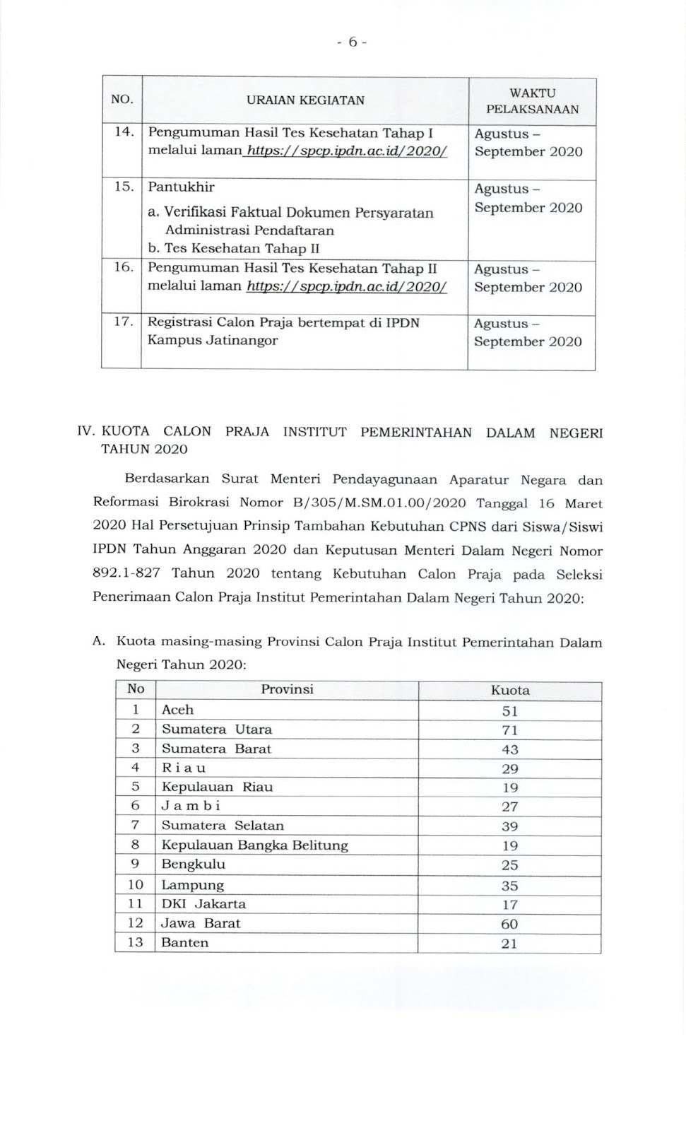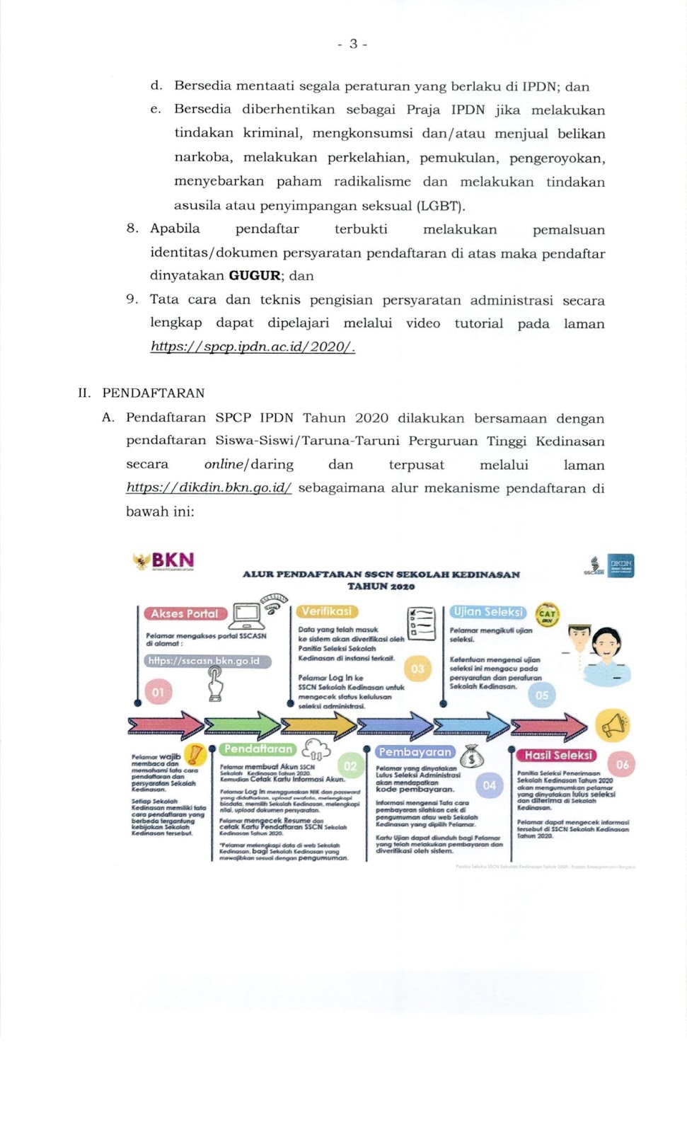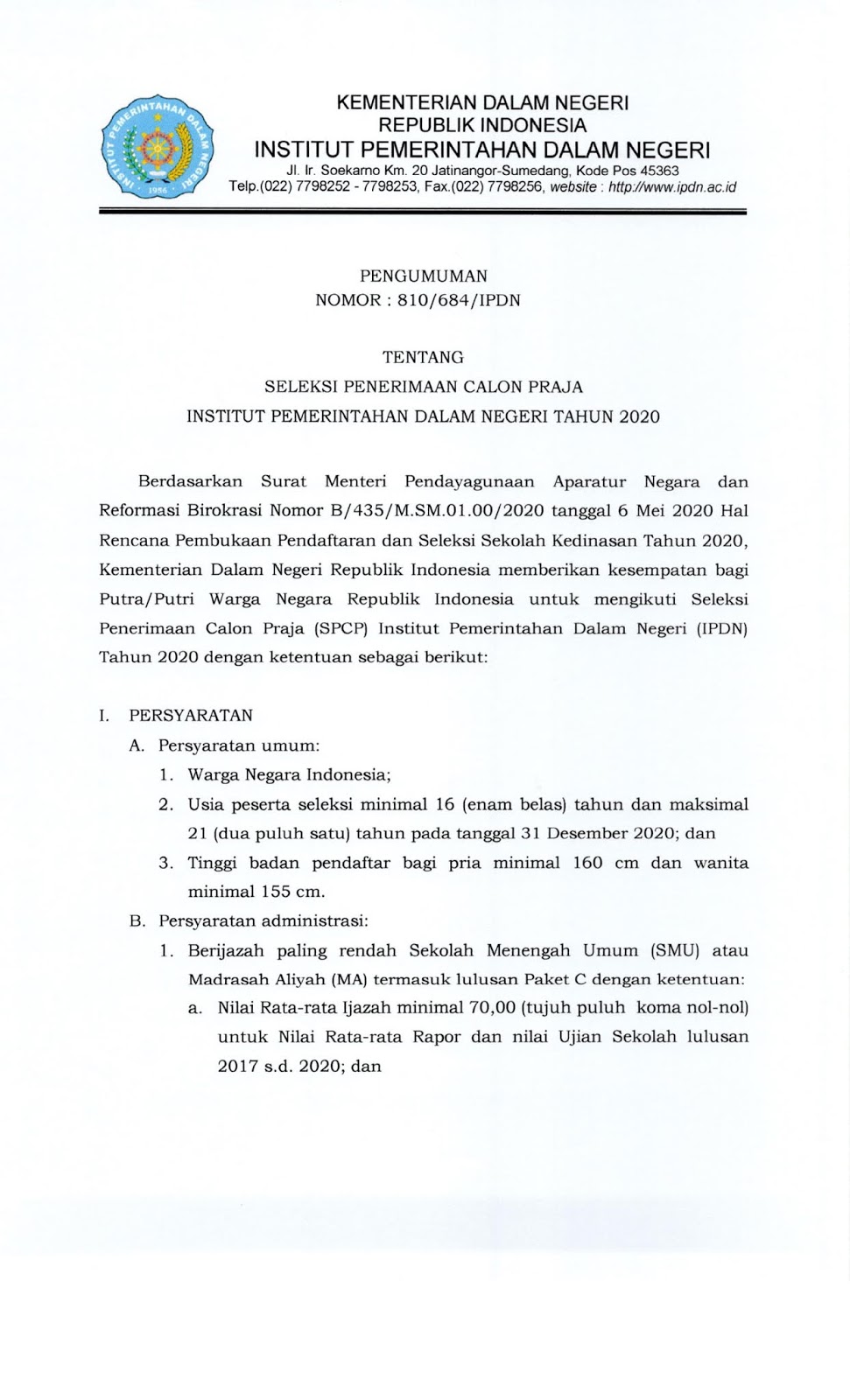 Berdasarkan Surat Menteri Pendayagunaan Aparatur Negara dan Reformasi Birokrasi Nomor B/435/M.SM.01.00/2020 tanggal 6 Mei 2020 Hal Rencana Pembukaan Pendaftaran dan Seleksi Sekolah Kedinasan Tahun 2020, Kementerian Dalam Negeri Republik Indonesia memberikan kesempatan bagi Putra/Putri Warga Negara Republik Indonesia untuk mengikuti Seleksi Penerimaan Calon Praja (SPCP) Institut Pemerintahan Dalam Negeri (IPDN) Tahun 2020