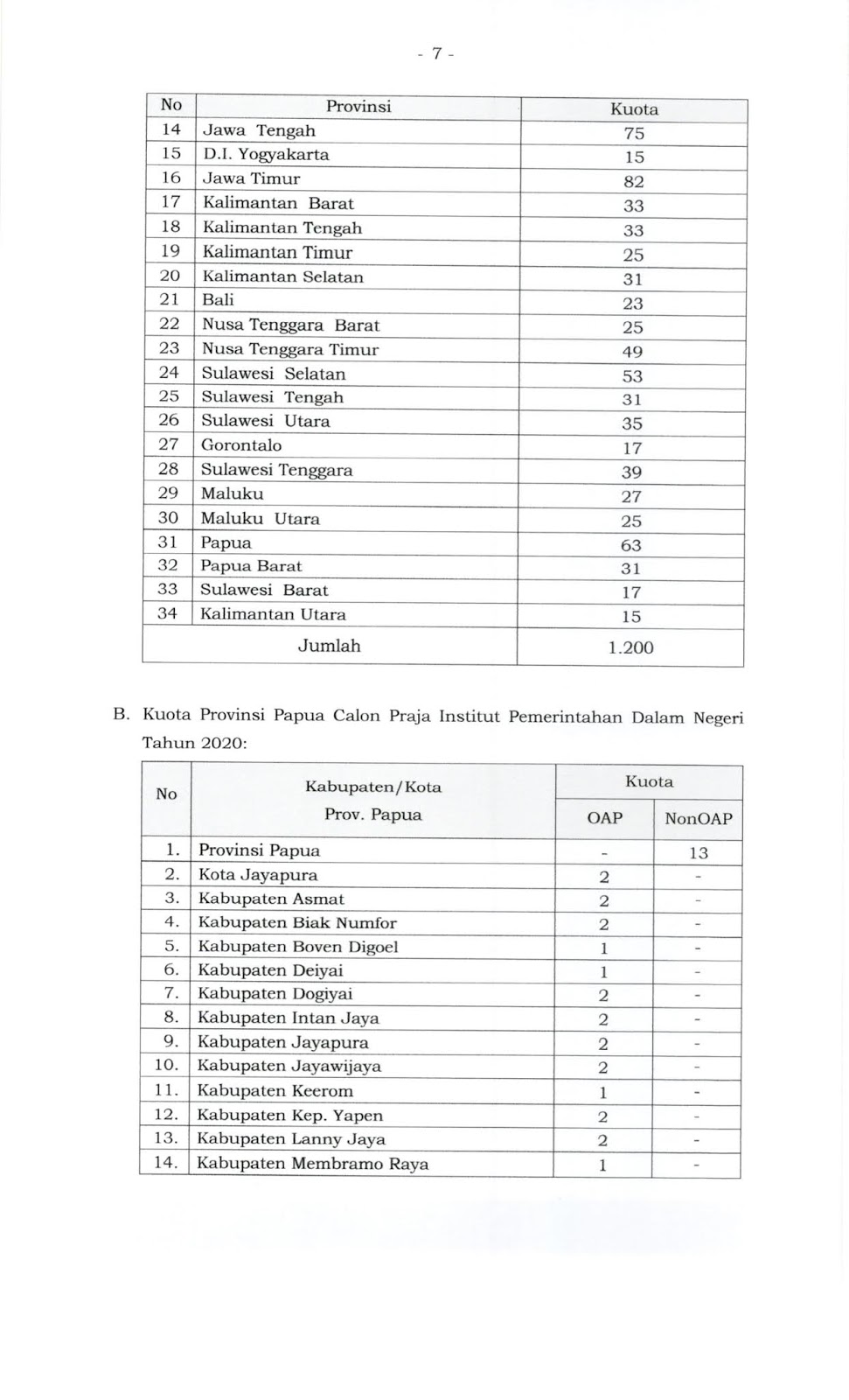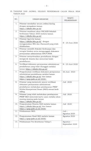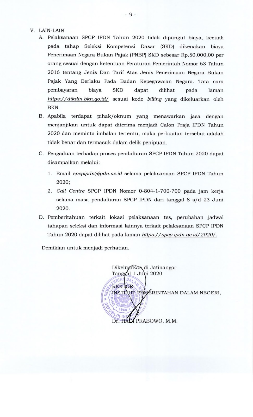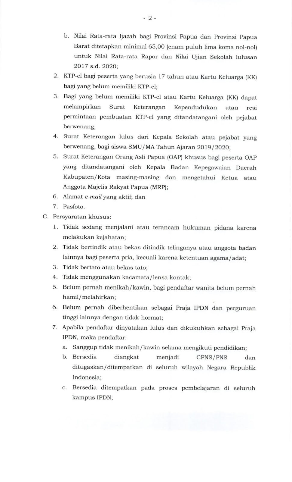 Berdasarkan Surat Menteri Pendayagunaan Aparatur Negara dan Reformasi Birokrasi Nomor B/435/M.SM.01.00/2020 tanggal 6 Mei 2020 Hal Rencana Pembukaan Pendaftaran dan Seleksi Sekolah Kedinasan Tahun 2020, Kementerian Dalam Negeri Republik Indonesia memberikan kesempatan bagi Putra/Putri Warga Negara Republik Indonesia untuk mengikuti Seleksi Penerimaan Calon Praja (SPCP) Institut Pemerintahan Dalam Negeri (IPDN) Tahun 2020