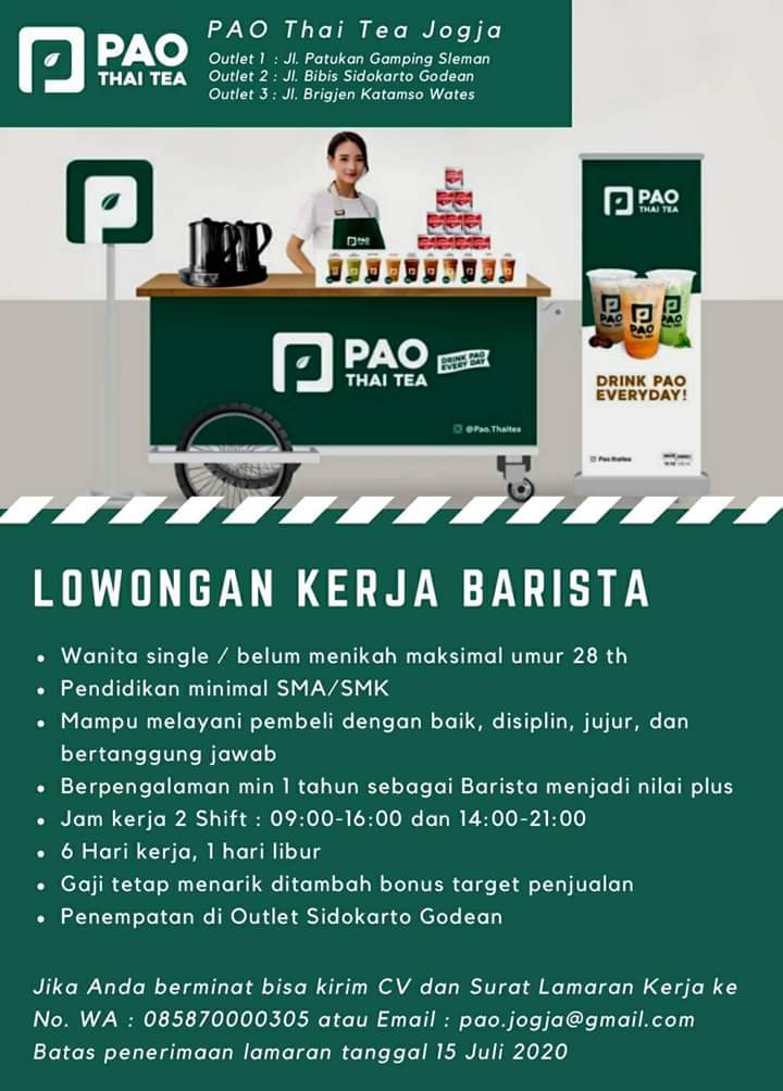 Lowongan Kerja Barista PAO Thai Tea Jogja