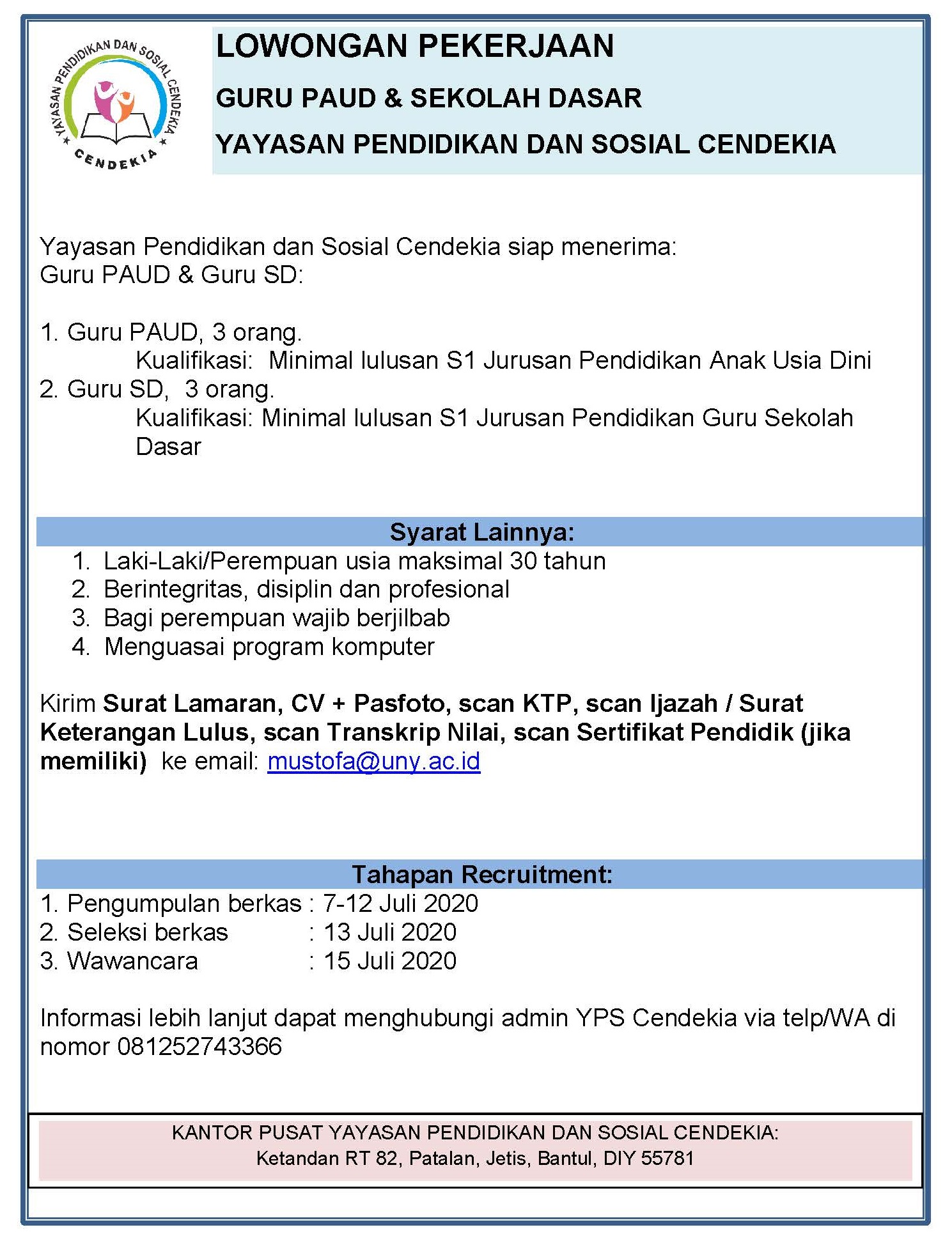 Lowongan Kerja Guru PAUD dan SD di Yayasan Pendidikan Dan Sosial Cendikia Bantul, Yogyakarta