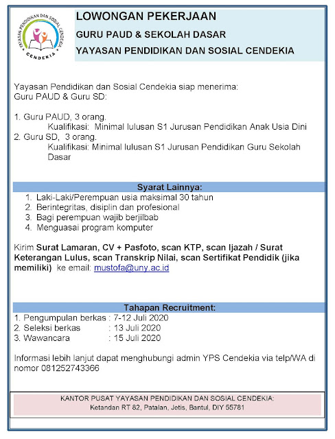 Lowongan Kerja Guru PAUD dan SD di Yayasan Pendidikan Dan Sosial Cendikia Jogja
