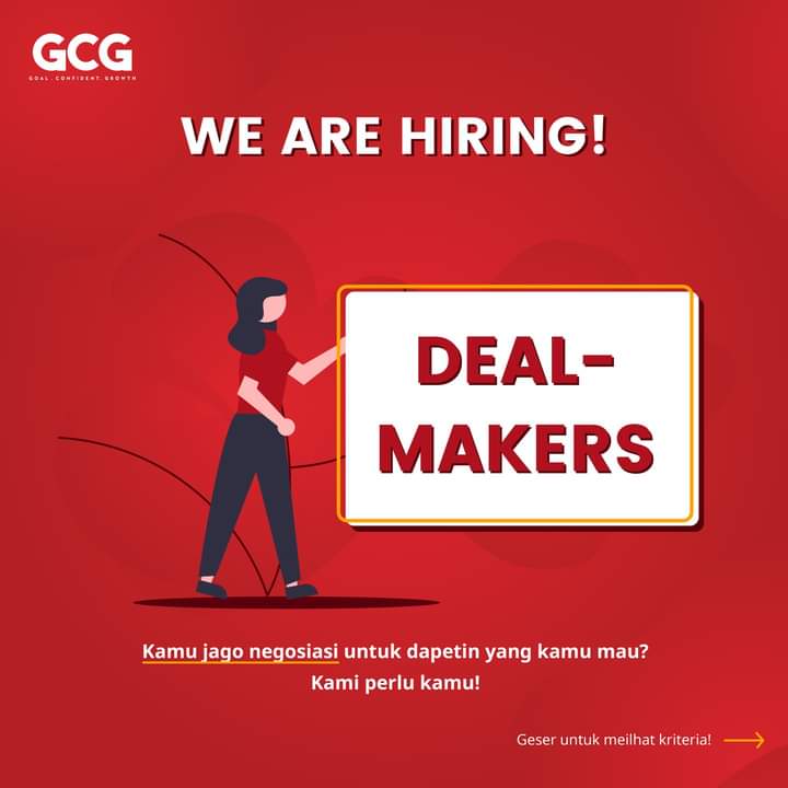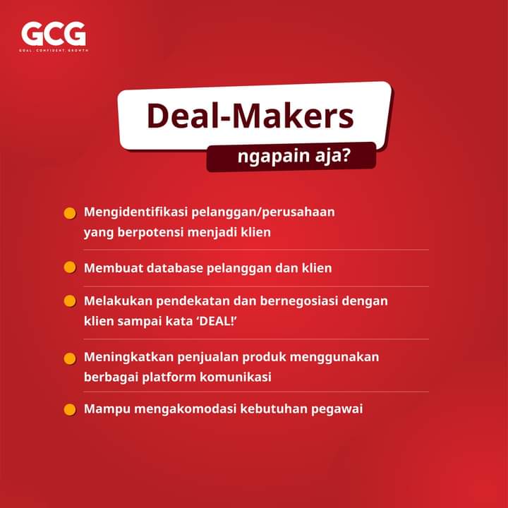 Saat ini kami membuka kesempatan berkarir bagi kamu tenaga professional yang memiliki passion di bidang Negosiasi untuk mengisi posisi sebagai DEAL MAKERS
