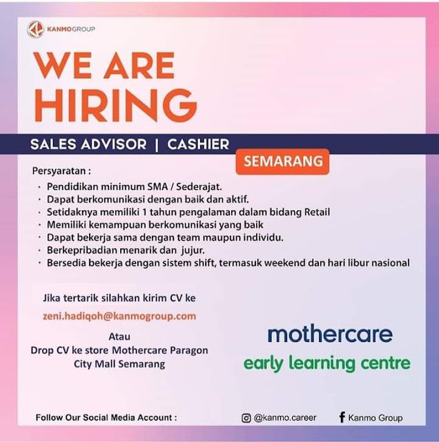 Dicari Sales Advisor (SPG Kasir) untuk Brand Mothercare dengan penempatan kerja di Store Mothercare Paragon Mall Semarang.